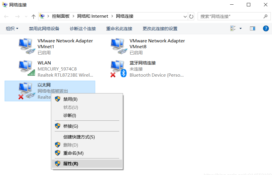 然后我们设置电脑的ip地址和其它的网络参数信息。在"控制面板“->“网络和Internet"->"网络连接”->“以太网”中,点击“属性”。如下图所示: