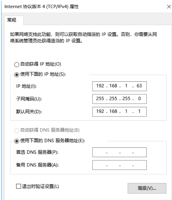 然后我们设置为“使用下面的IP地址”,“IP地址”为192.168.1.63,“子网掩码”为255.255.255.0,“默认网关”为192.168.1.1。(这里大家可以根据自己的需要自行设置,要保证跟电脑跟摄像机的ip为同一个网段,并且ip不会冲突)设置完后点“确定”。