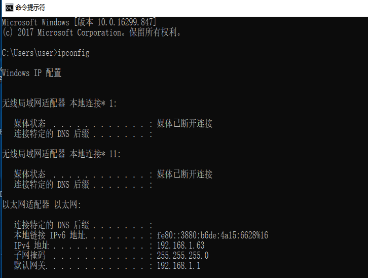 不用管上面的现象,打开命令提示符,输入命令:ipconfig,可以看到电脑的ip地址已经被更改为192.168.1.63了
