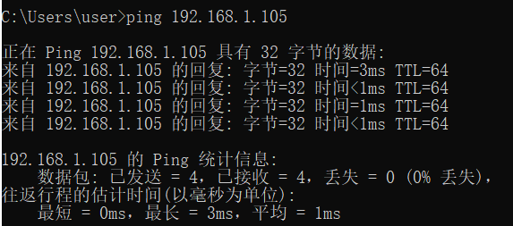 我们试ping一下摄像机的ip地址192.168.1.105,如下图所示,发现可以ping通。