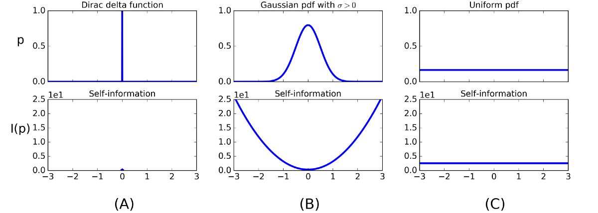 我们也可以计算连续随机变量的自信息。图 2 展示了三种不同的概率密度函数及其对应的信息函数。图 2(A)所示的 Dirac delta 对应着很强的偏差,总是同一面朝上的偏畸硬币对应着零熵。所有 p(x)= 0 的地方都对应着无限高的信息量。然而,由于这些零概率的事件永远不会发生,所以这只是一个假设。图 2(B)中的高斯概率密度函数就是对那种经常同一面朝上,但不总是同一面朝上的情况的模拟。最后,图 2(C)描述的是一个均匀分布概率密度函数,它对应着均匀的信息量,和我们没有偏畸的硬币是类似的。