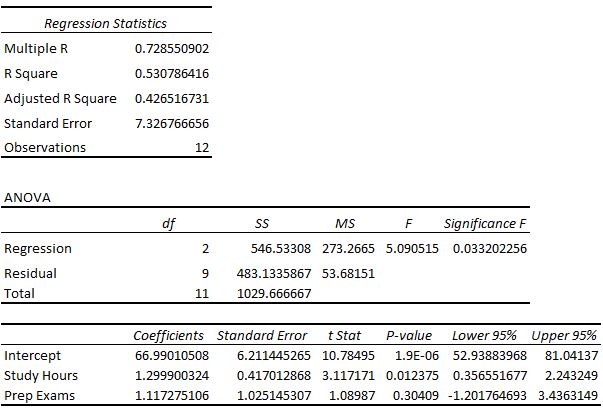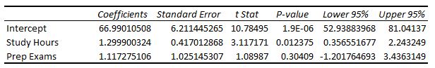 \(\large \text{final exam score} = 66.99 + 1.299(Study\ Hours) + 1.117(Prep\ Exams)\)