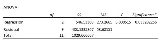 In this example, the p-value is 0.033, which is less than the common significance level of 0.05. This indicates that the regression model as a whole is statistically significant, i.e. the model fits the data better than the model with no predictor variables.