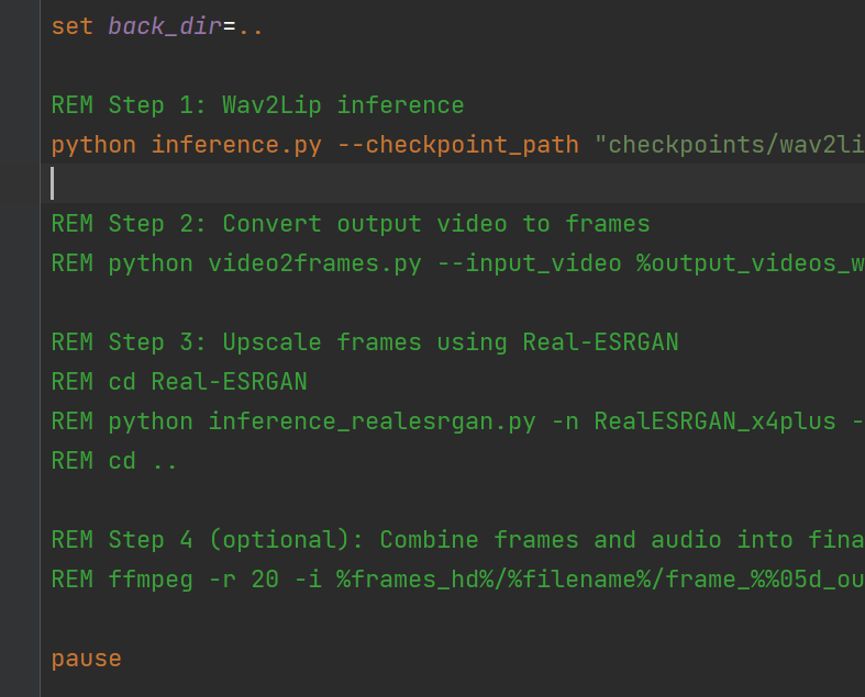 看了一下日志,先使用Wav2Lip生成对嘴视频,然后将视频拆分为每一帧图片(文件夹frames_wav2lip中查看),然后将所有图片高清处理(处理后的图片在文件夹frames_hd 中),最后将高清图片转为视频,并且加上音频。