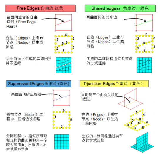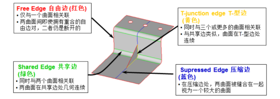 曲面自动网格划分产生的结果与曲面的拓扑状态有很大关系。曲面拓扑状态指曲面间的连接关系,合适的曲面连接将产生恰当的网格模型。HyperMesh 使用曲面边界的颜色来表达曲面拓扑状态。