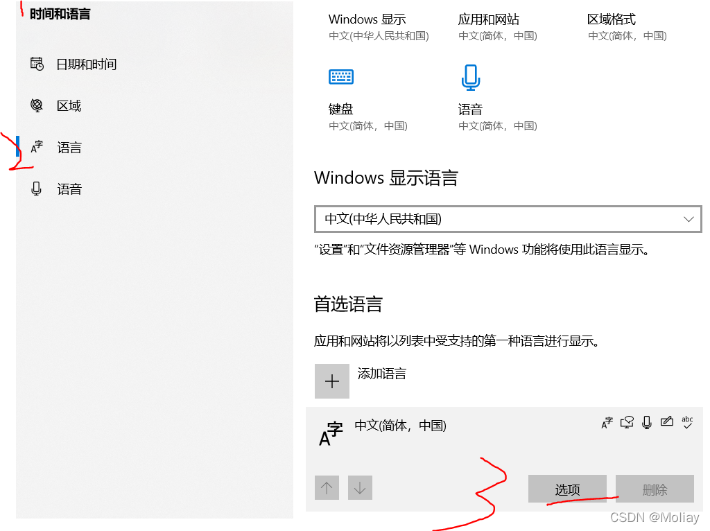 设置——》时间与语言——》语言——》中文——》选项