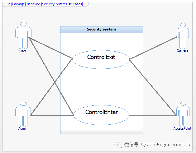 我们说,用例图传递了一系列的用例,那么在SysML中用例图如何表述呢?下面先睹为快。如下图所示,这是一个 “Security System” 系统的SysML用题图。图头部是SysML通用的头部结构,其中图类型为 “uc”,即用题图。用例图的内容区域部分展示了四种模型元素: