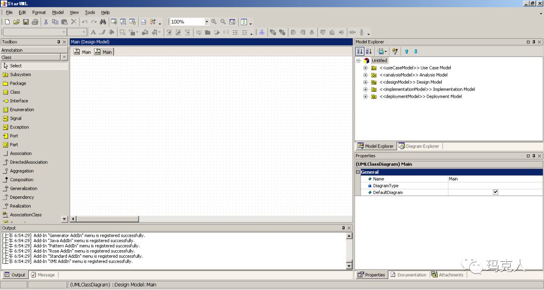 starUML是开源的基于统一模式语言与模式驱动开发的平台,前身是Plastic,从1996年开始开发。1998年开始,Plastic转变为UML建模工具。2005年改名为StarUML,最新版本StarUML 5.0已经是一款功能全面的产品,支持UML2.0,支持MDA,Java、C++、C#转换,MS-Office集成,XMI等。