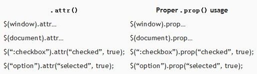 为了让jQuery1.6中的.attr()方法的变化被理解的清楚些,下面是一些使用.attr()的例子,虽然在jQuery之前的版本中能正常工作,但是现在必须使用.prop()方法代替: