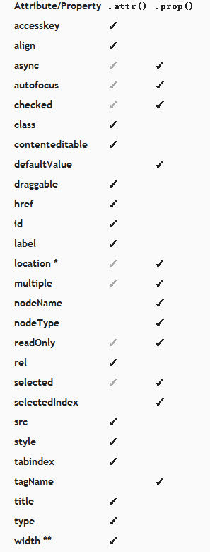 下面是一些attributes和properties的列表,正常情况下,应该使用其对应的方法(见下面的列表)来取得和设置它们。下面的是首用法,但是.attr()方法可以运行在所有的attributes情况下。