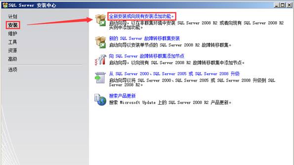 2) 在SQL Server 安装中心界面上,点击左侧的“安装” ,然后在右边的选项里选择“全新安装或向现有安装添加功能”