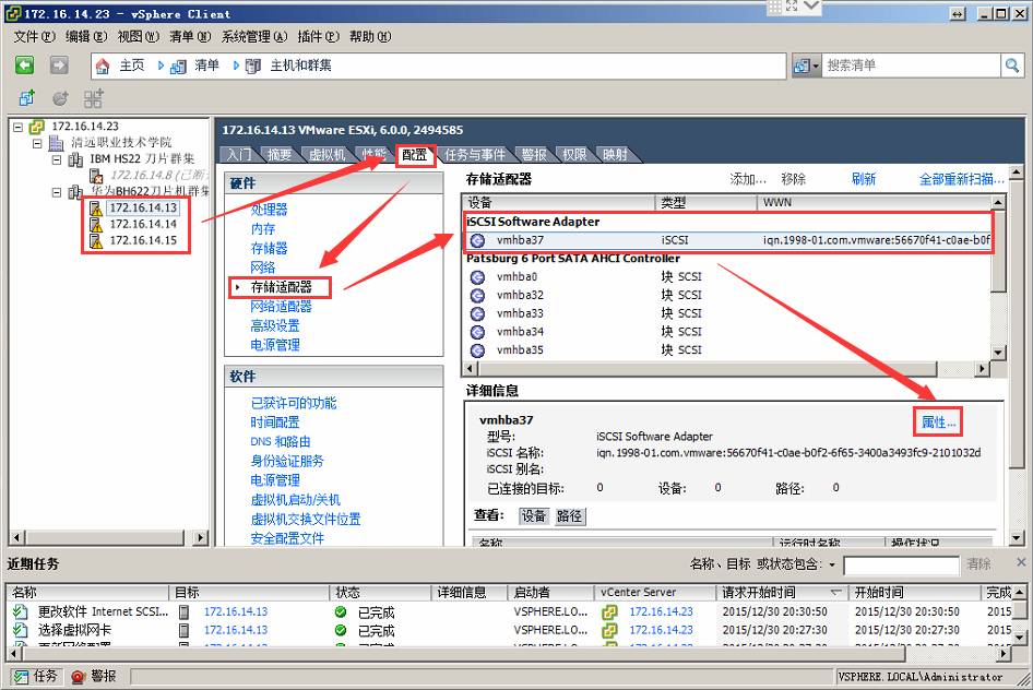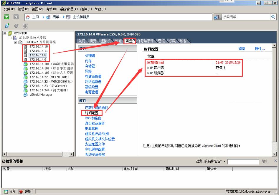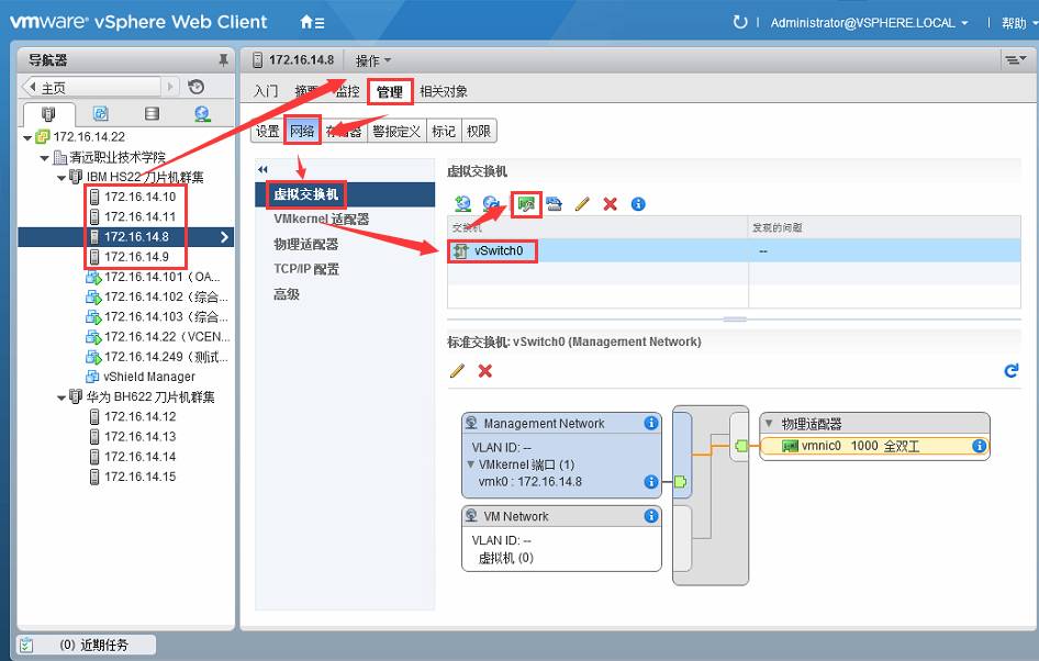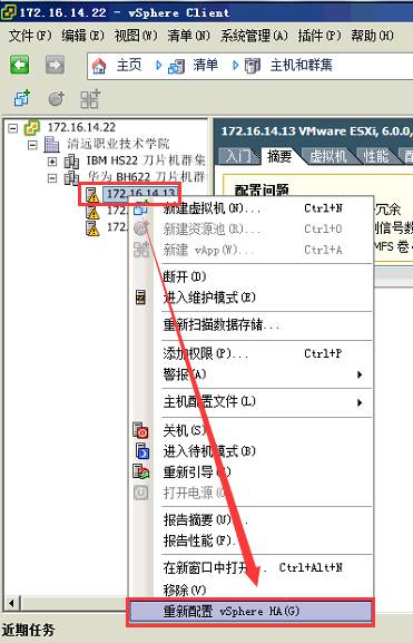 vSphere配置完成群集的HA后在主机的摘要栏提示“此主机当前没有管理网络冗余”,若由于部署环境限制没有可用的冗余网络时(刀片服务器虽然有两块网卡,但不能用于vSphere的冗余,因vSphere无法检测到外部网络中断),只能通过以下方法解决屏蔽此警告。