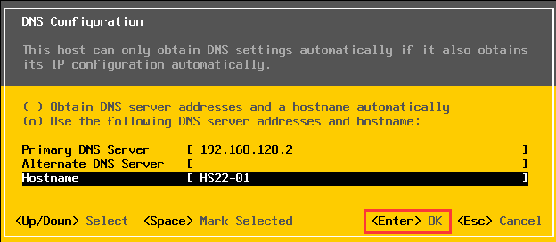 5) 选择“DNS Configuration”,按“回车”进入DNS和主机名的配置界面(若无DNS或域控服务器,第五、六步可以不配置)