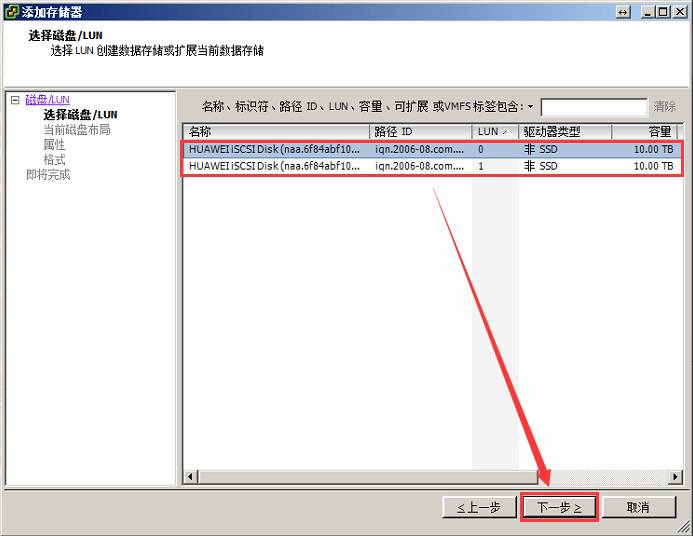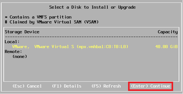 6) 在选择磁盘页面中,选择要在其上安装 ESXi 的存储设备,如果这里有iSCSI存储设备也可以进行选择,然后按“回车”进入下一步