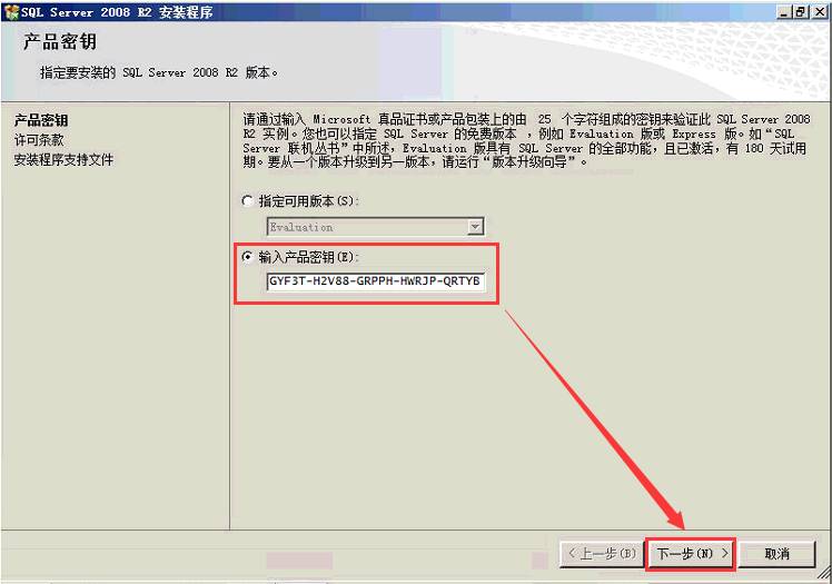 4) 输入产品密钥,此时输入框中自含密钥,无须输入,下一步