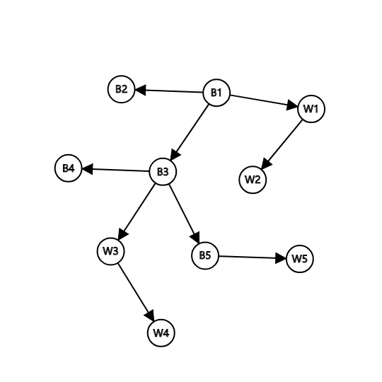 对于这棵树,我们的fB1,0f_{B1,0}fB1,0就等于跟它颜色一样的B2B2B2的子树中颜色为BBB且与B2B2B2连通的连通块大小,即111