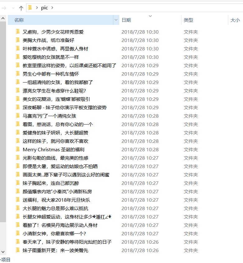 当你运行代码后,文件夹就会越来越多,如果爬完的话会有2000多个文件夹,20000多张图片。不过会很耗时间,可以在最后的代码设置爬取页码范围。