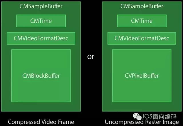 是一个容易让人误解的数据结构,它可以包含已压缩数据(CMBlockBuffer)或未压缩数据(CVPixelBuffer)及相关描述信息,如下图所示。
