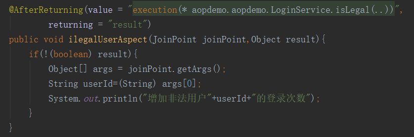 接下来假如我们又有了一个新需求,就是要对不合法用户做些特殊的处理,比如说统计下不合法用户调用登陆接口的次数。由于直接修改原有的登录逻辑有很多弊端,所以我们还是选择通过AOP来实现该功能。这可以通过编写一个返回增强来实现: