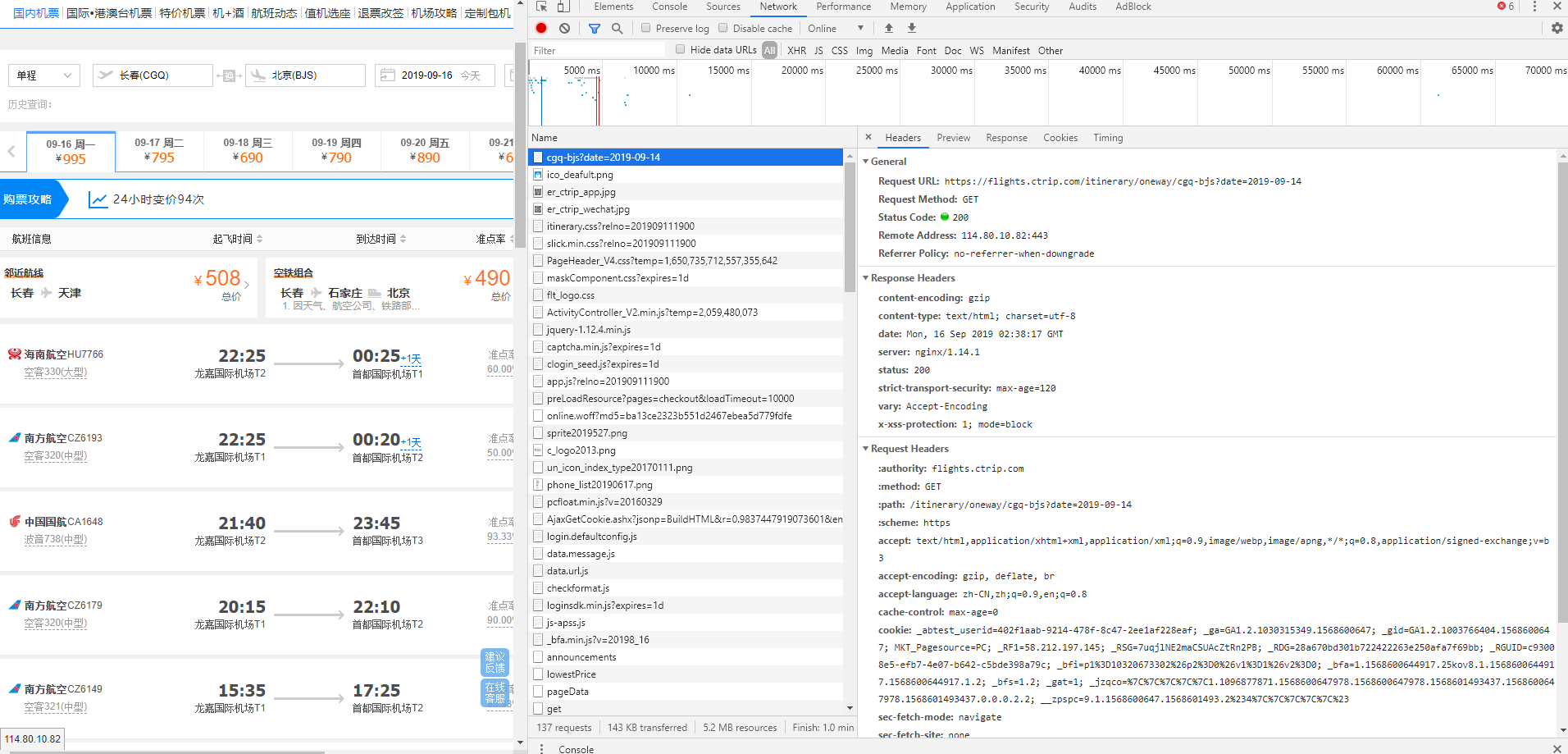 我们只需要知道我们最开始请求的https://flights.ctrip.com/itinerary/oneway/cgq-bjs?date=2019-09-14这个网页中有一段js脚本,在这个网页请求到之后会去执行,而这段脚本的目的就是去请求我们要爬的航班信息。