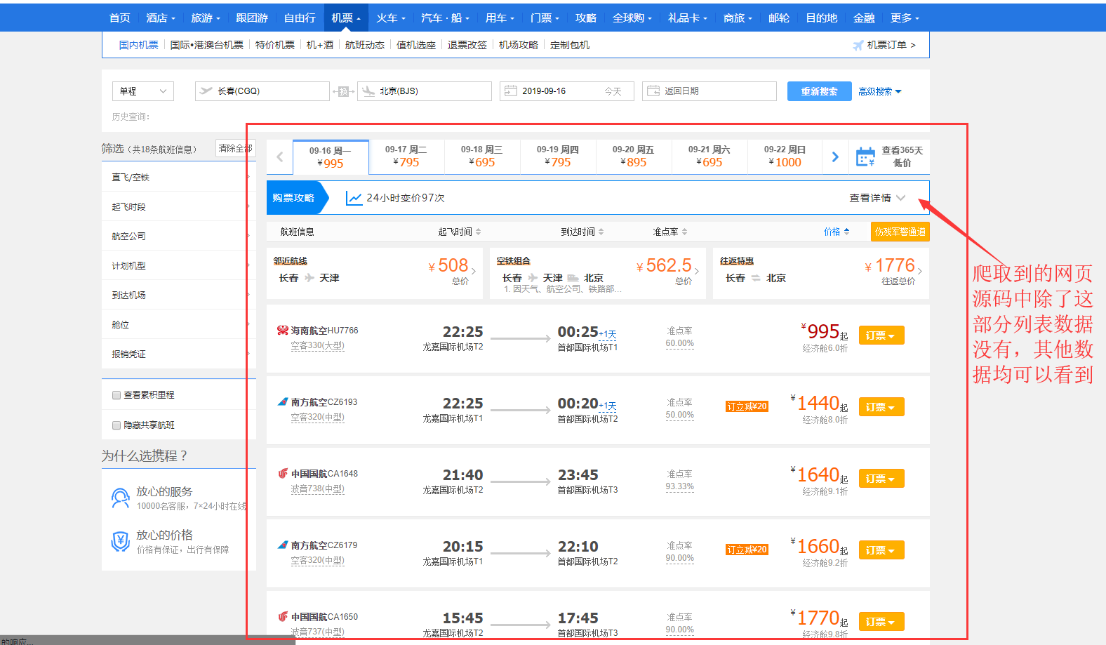 这个问题大多数发生在目标数据是那些列表型的网页,比如说前几天班上一个同学问了我一个问题,他在爬携程的航班信息时,爬下来的网页除了获得不了航班的信息,其他地方都可以拿到。