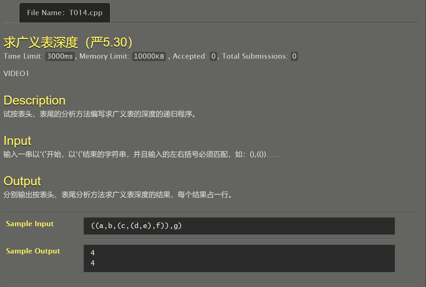 求广义表深度(严5.30)--------西工大noj的更多相关文章
