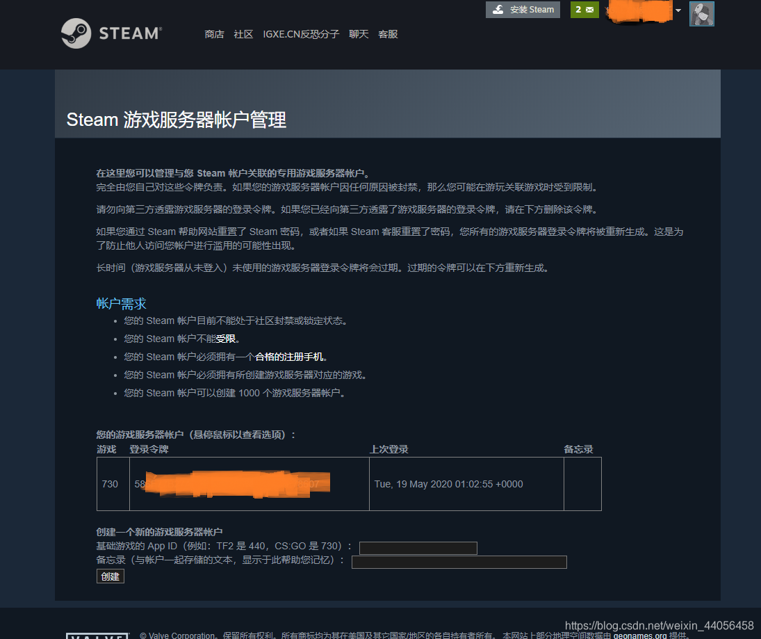 点击创建之后便获得了登录令牌,不要将该令牌泄露出去,该令牌用于服务器在CS:GO社区服务器中验证