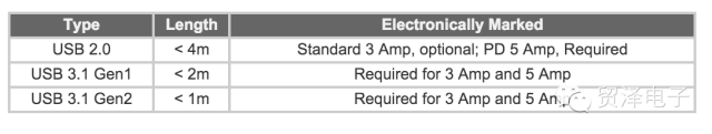Type-C电缆两端安装了Type-C连接器。其支持USB 2.0和USB 3.1的功能及数据传输速度,还可以实现PD。Type-C标准电缆的实际长度及电子标记的电缆需求见表3。实现PD和全功能Type-C电缆必须进行电子标记。从Vconn(或其他来源)中获得高达1W的功率来支持电缆的电子标记。