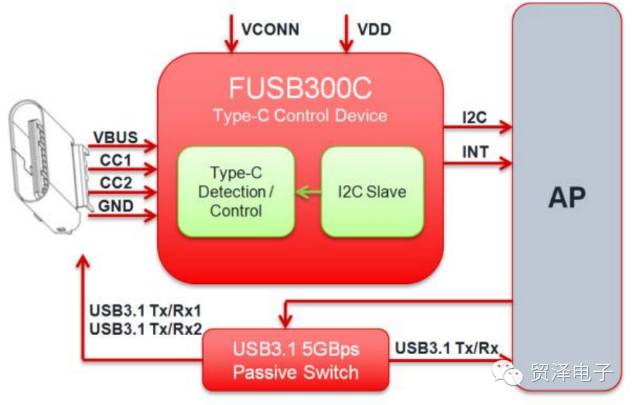 图3: FUSB300C是一种灵活的、轻型的用于USB Type-C的客户机解决方案,包括阴影检测和配置,类似于OTG端口。