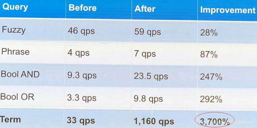 如下所示,除了Term检索,Fuzzy,Phrase, Bool And .Bool OR都有大幅的性能提升!