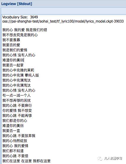 经过差不多20分钟的学习,PAI已经掌握了几位歌坛大神的歌词技巧,下面就看看PAI写出来的歌词是怎样的。(歌词需要在log中查看,可以参考https://yq.aliyun.com/articles/72841