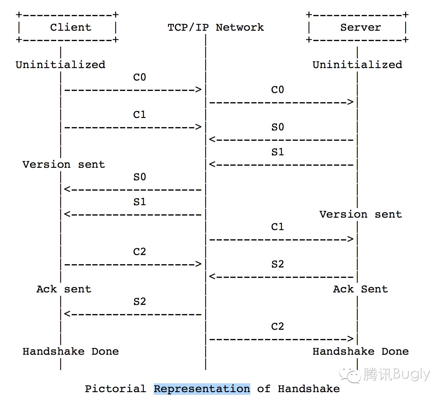 握手开始于客户端发送C0、C1块。服务器收到C0或C1后发送S0和S1。