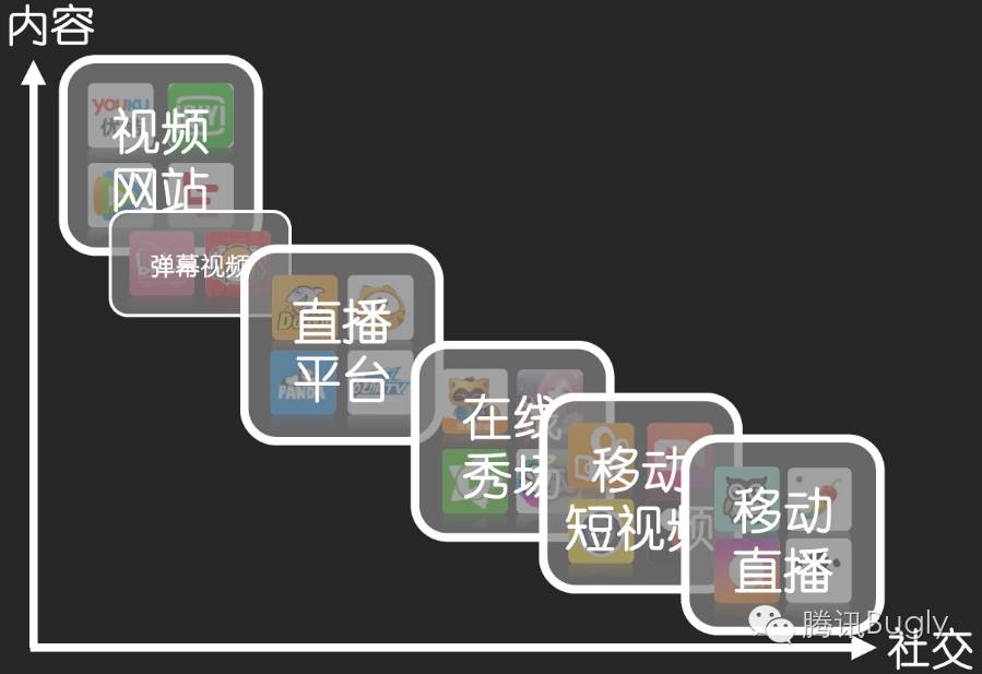先将这些APP按照视频网站按照视频网站、弹幕视频、直播平台、在线秀场、移动短视频、移动直播来划分类别。再按照内容和社交这个维度来进行区分,可以明显看出视频网站、弹幕网站和直播平台更偏内容,他们对内容的需求更加高,用户在上面进行社交沉淀相对比较浅。