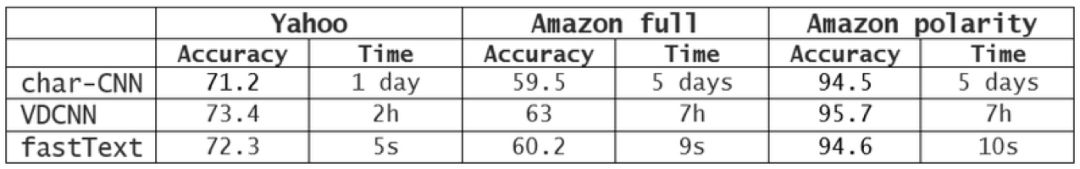 fastText最惊艳的地方在于,和最前沿深度神经网络模型相比,它在分类精度等指标毫不逊色的情况下,把训练和推断速度降低了几个数量级!按Facebook的报告,在普通多核CPU上,10亿词的文本训练时间小于10分钟,50万句子分到31.2万类别用时小于1分钟。