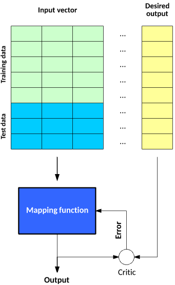 You build and test a mapping function with supervised learning in two phases (see image below). In the first phase, you segment a data set into two types of samples: training data and test data. Both training and test data contain a test vector (the inputs) and one or more known desired output values. You train the mapping function with the training data set until it meets some level of performance (a metric for how accurately the mapping function maps the training data to the associated desired output). In the context of supervised learning, this occurs with each training sample, where you use the error (actual vs. desired output) to alter the mapping function. In the next phase, you test the trained mapping function against the test data. The test data represents data that has not been used for training and provides a good measure for how well the mapping function generalizes to unseen data.