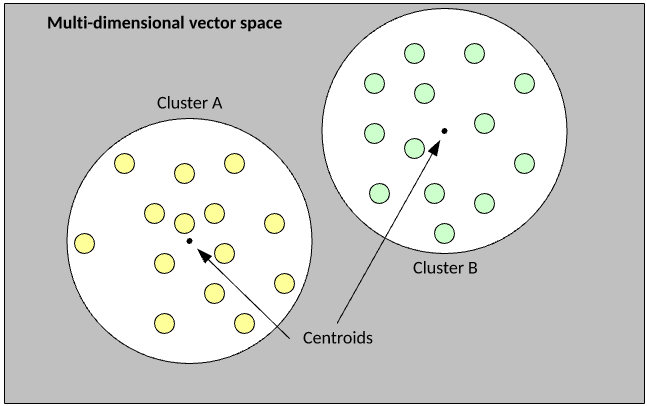 As illustrated, k-means partitions the example data set into k clusters without any understanding of the features within the example vectors (that is, without supervision).