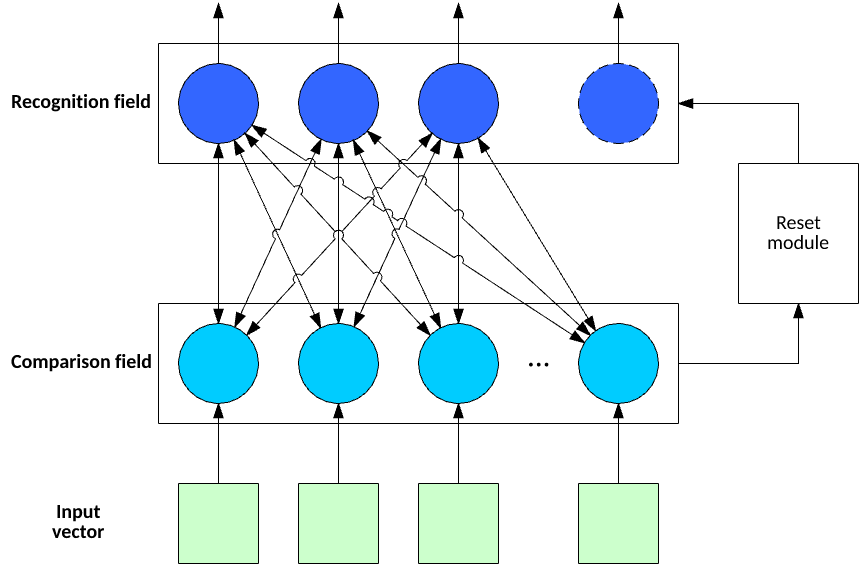 ART1 includes three key features: a comparison field (used to determine how a new feature vector fits within the existing categories), a recognition field (contains neurons that represent the active clusters), and a reset module. When the input vector is applied, the comparison field identifies the cluster in which it most closely fits. If the input vector matches in the recognition field above a vigilance parameter, then the connections to the neuron in the recognition field are updated to account for this new vector. Otherwise, a new neuron is created in the recognition field to account for a new cluster. When a new neuron is created, the existing neuron weights are not updated, allowing them to retain the existing knowledge. All examples of the data set are applied in this way until no example input vector changes cluster. At this point, training is complete.