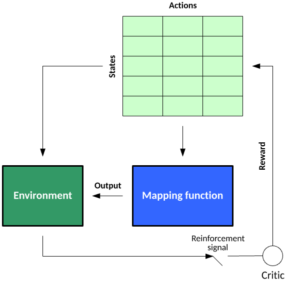 Unlike supervised learning, where a critic grades each example, in reinforcement learning, that critic may only provide a grade when the goal state is met (having a hand with the state of 21).