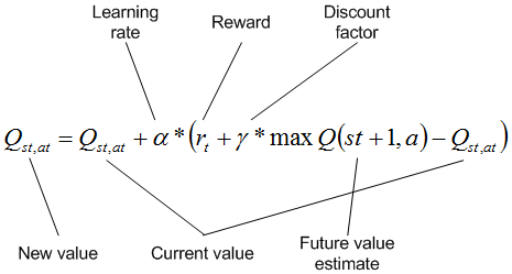 Q values are updated for each state–action pair as an action is selected for a given state. The Q value for the state–action pair is updated with some reward provided by the move (may be nothing) along with the maximum Q value available for the new state reached by applying the action to the current state (discounted by a discount factor). This is further discounted by a learning rate that determines how valuable new information is over old. The discount factor indicates how important future rewards are over short-term rewards. Note that the environment may be filled with negative and positive rewards, or only the goal state may indicate a reward.