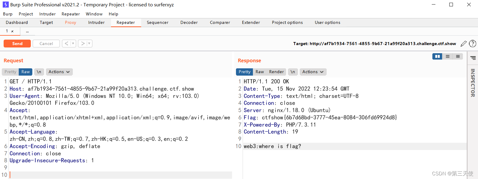 通过 burpsuite 抓包,flag 在返回的响应数据包里面。