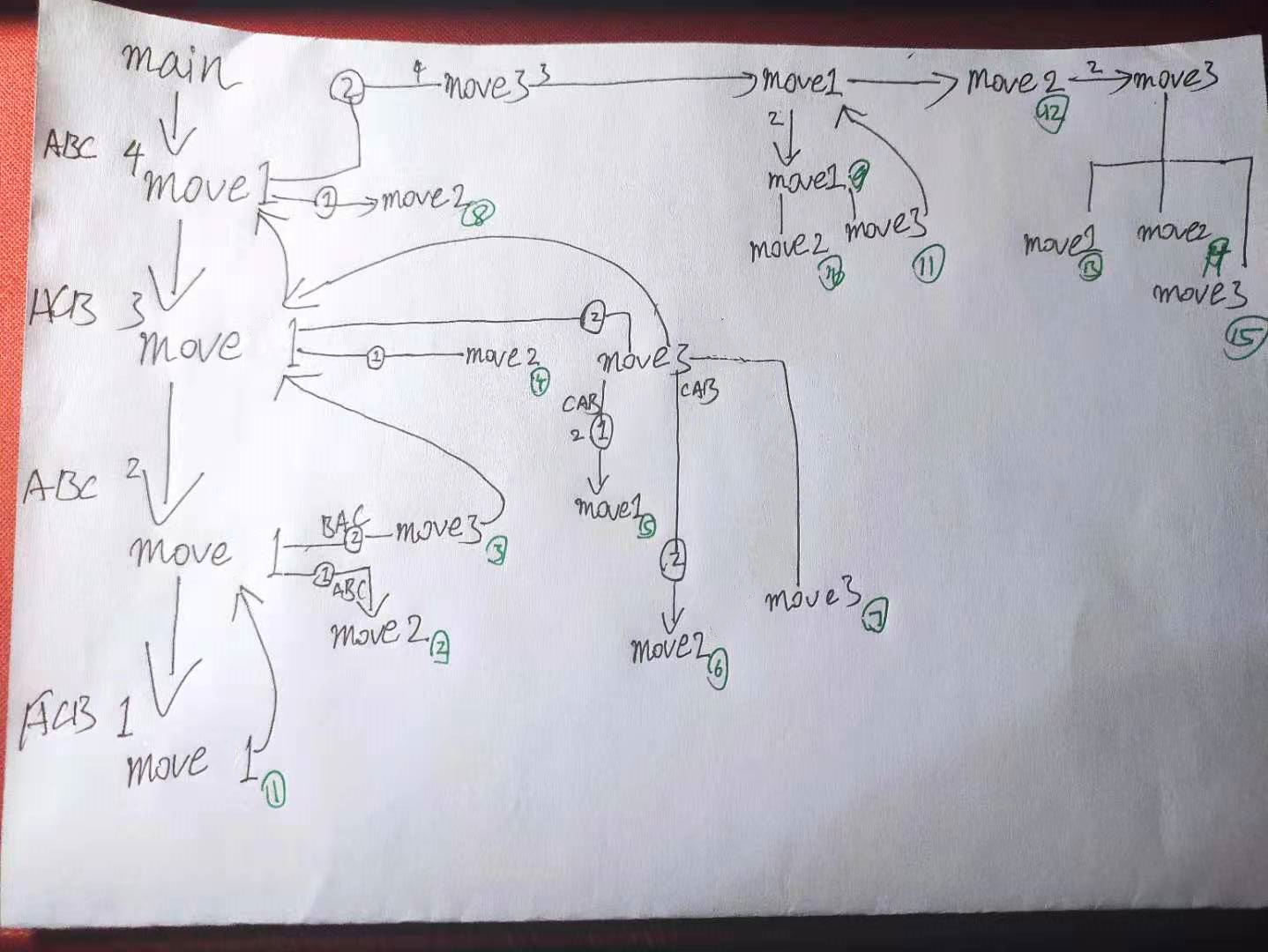 这是我之前追踪四层汉诺塔运行步骤画的笔记