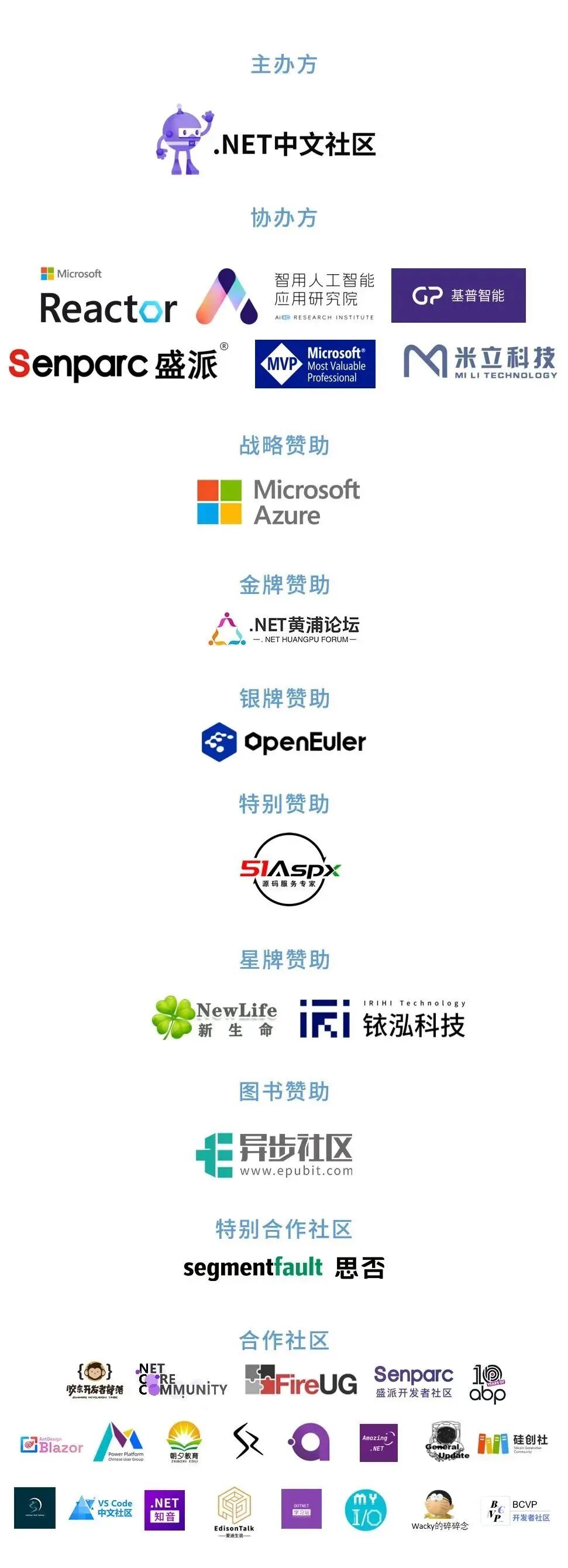 感谢 Microsoft Azure 为本次大会提供战略支持,感谢金牌赞助 .NET 黄浦论坛,银牌赞助 OpenEuler,特别赞助 51Aspx,星牌赞助新生命,以及星牌赞助铱泓科技。同时,还要感谢胶东开发者部落、.NET Core Community、FireUG、盛派开发者社区、abp.io、AntDesign Blazor、Power Platform 中文社区、朝夕教育、Semantic Kernel 中文社区、Avalonia 社区、Amazing.NET、General Update、硅创社、公众号“桑榆呀”、VS Code 中文社区、.NET 知音、爱迪生说、DOTNET学习站、my I/O、Wacky 的碎碎念、BCVP 开发者社区对本次大会的大力支持!