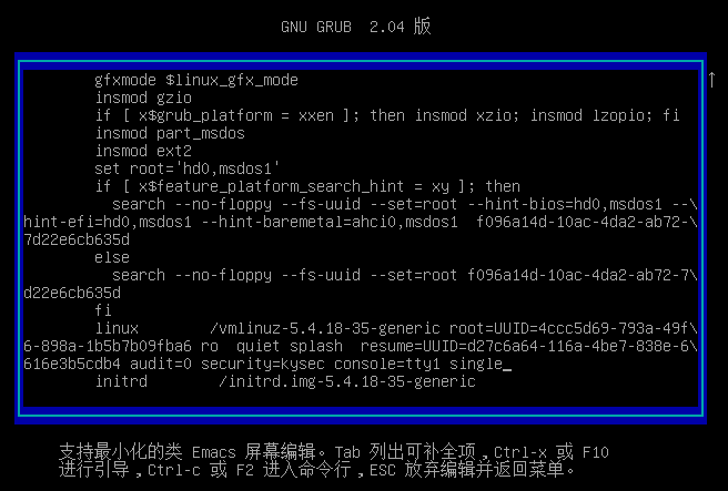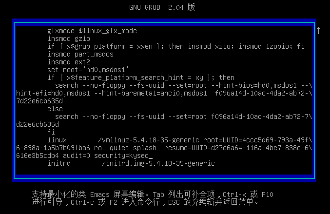 光标通过键盘上下左右键移到linux行最后一句(此处是seurity=kysec后)