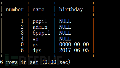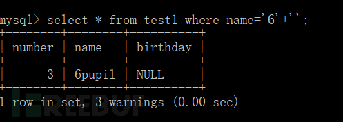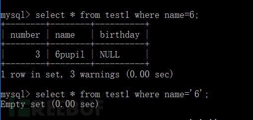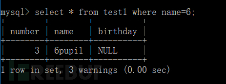 这里为什么我们输入为什么name=0会导致返回数据呢?其实这里跟php弱类型有异曲同工之妙,mysql在比较一个整数和一个字符串也会强制把字符串转化为整数进行比较,并返回一个warning,所以这里