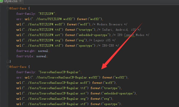2、然后在工程新建style.css,使用@font-face中的font-family和src引入字体,在src的属性值填写“url(“路径”)”即可: