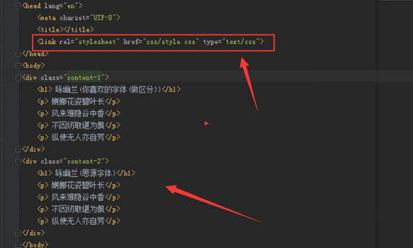 3、然后打开html文件,写入一些文字,在上方的head标签中引用css,使用link标签引入,在href中写入css文件的路径即可: