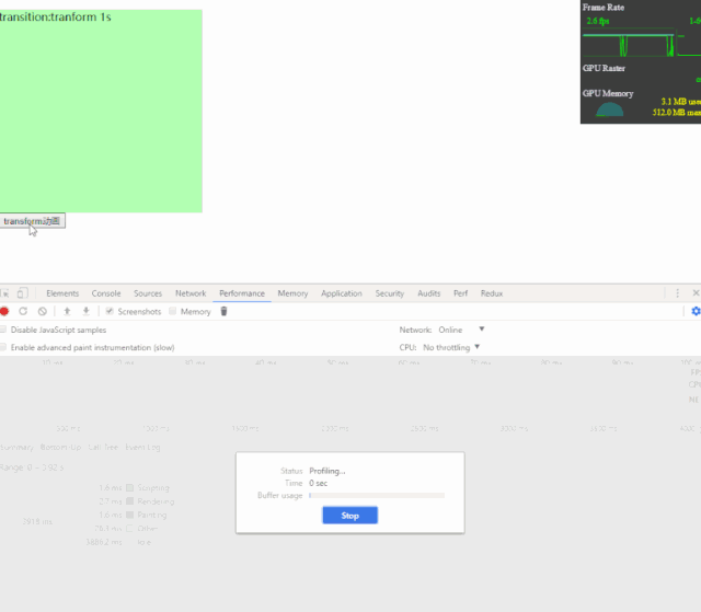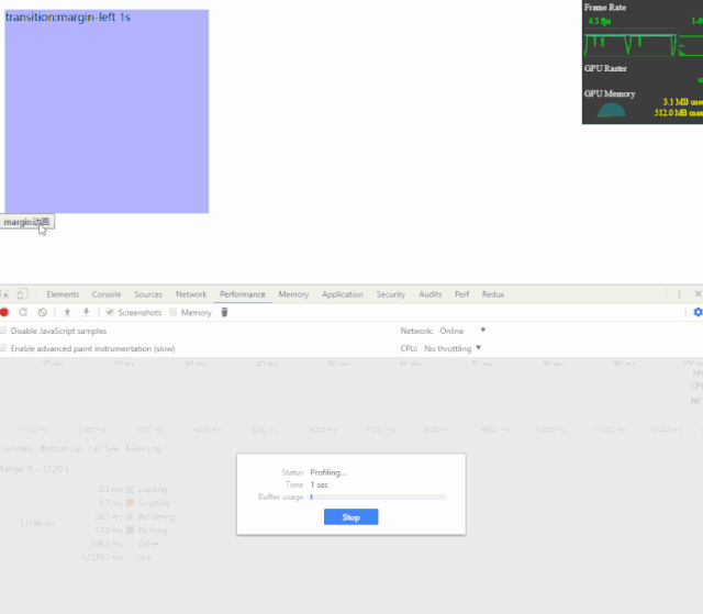 在使用height,width,margin,padding作为transition的值时,会造成浏览器主线程的工作量较重,例如从margin-left:-20px渲染到margin-left:0,主线程需要计算样式margin-left:-19px,margin-left:-18px,一直到margin-left:0,而且每一次主线程计算样式后,合成进程都需要绘制到GPU然后再渲染到屏幕上,前后总共进行20次主线程渲染,20次合成线程渲染,20+20次,总计40次计算。