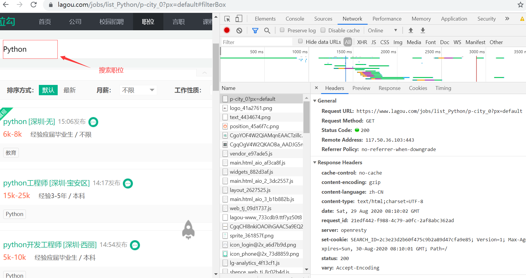 目标网址: https://www.lagou.com/jobs/list_Python/p-city_0?px=default (拉钩Python职位)