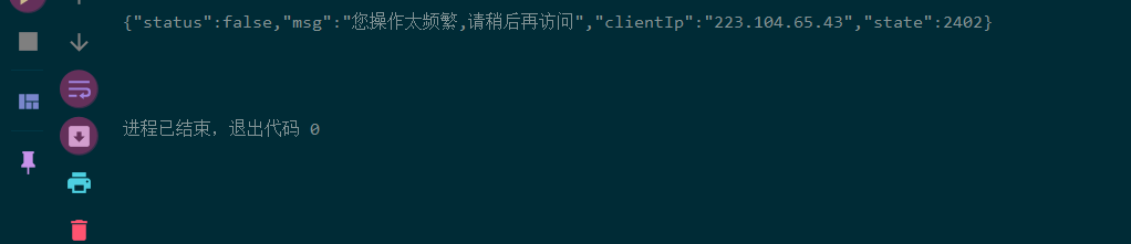 {"status":false,"msg":"您操作太频繁,请稍后再访问","clientIp":"223.104.65.43","state":2402}