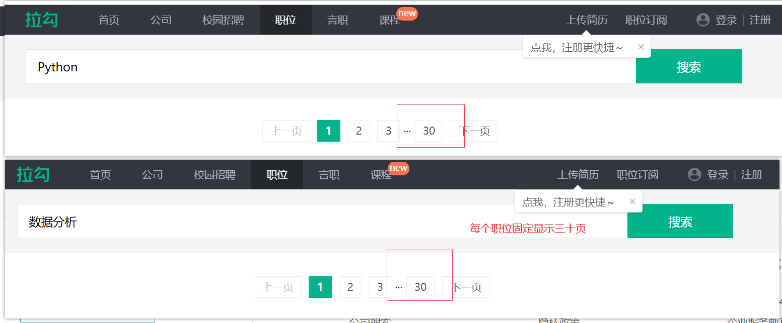 由上图可看出若爬取多个职位名信息的情况下,使用while循环获取每个职位的总页数是非常明智的选择。